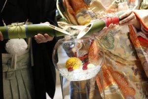 別々の水(環境)で育った新郎新婦が、それぞれの家風の違いを乗り越えて一つとなり、二人で新たな家庭、水(環境)を築いて行けるようにとの願いが込められて行う水合わせの儀。ここに新たなご家族の誕生です!!